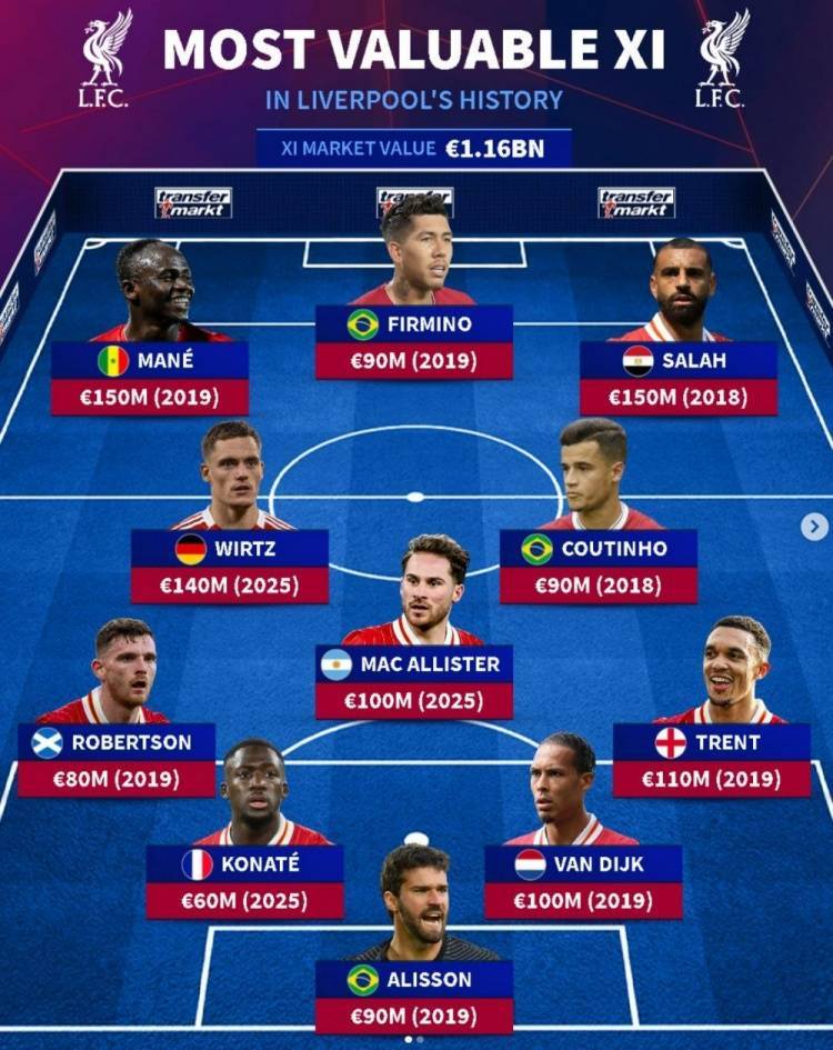 罗伯逊(2019年,8000万欧)、科纳特(2025年,6000万欧)、范迪克(2019年,1亿欧)、阿诺德(2019年,1.1亿欧)